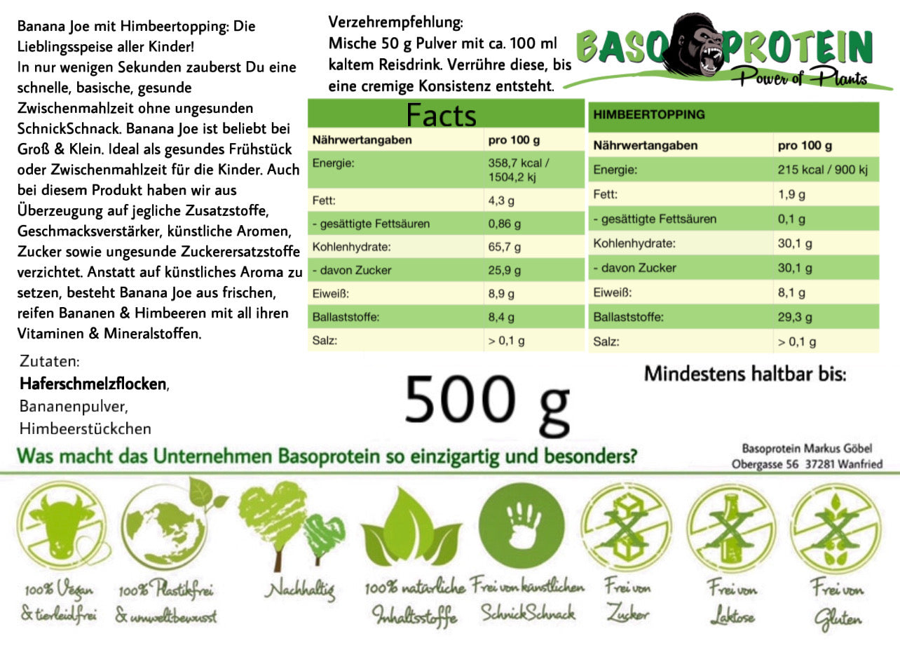 Banana Joe mit Himbeertopping: Die Lieblingsspeise aller Kinder! In nur wenigen Sekunden zauberst Du eine schnelle,  basische, gesunde Zwischenmahlzeit ohne ungesunden SchnickSchnack. Banana Joe ist beliebt bei Groß & Klein. Auch bei diesem Produkt haben wir aus Überzeugung auf jegliche Zusatzstoffe, Geschmacksverstärker, künstliche Aromen, Zucker sowie ungesunde Zuckerersatzstoffe verzichtet. Anstatt auf künstliches Aroma zu sitzen, besteht Banana Joe aus frischen, reifen Bananen & Himbeeren mit all ihren Vitaminen & Mineralstoffen.