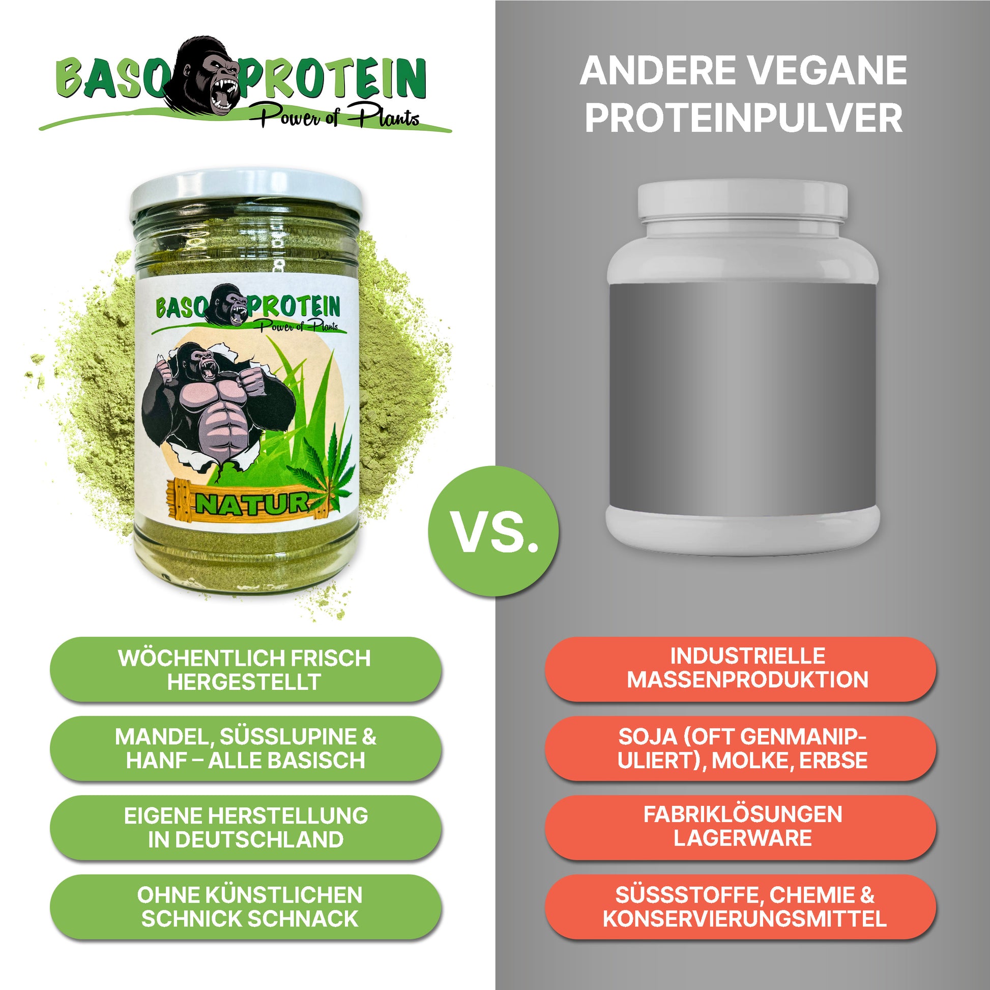 Unsere Produkte sind 100 % pflanzlich, basisch und frei von künstlichen Zusätzen, Zucker sowie ungesunden Ersatzstoffen. Wir kombinieren hochwertige Rohstoffe wie Süßlupine, Hanf, Mandel oder Kurkuma mit funktionellen Rezepturen für deinen Alltag.