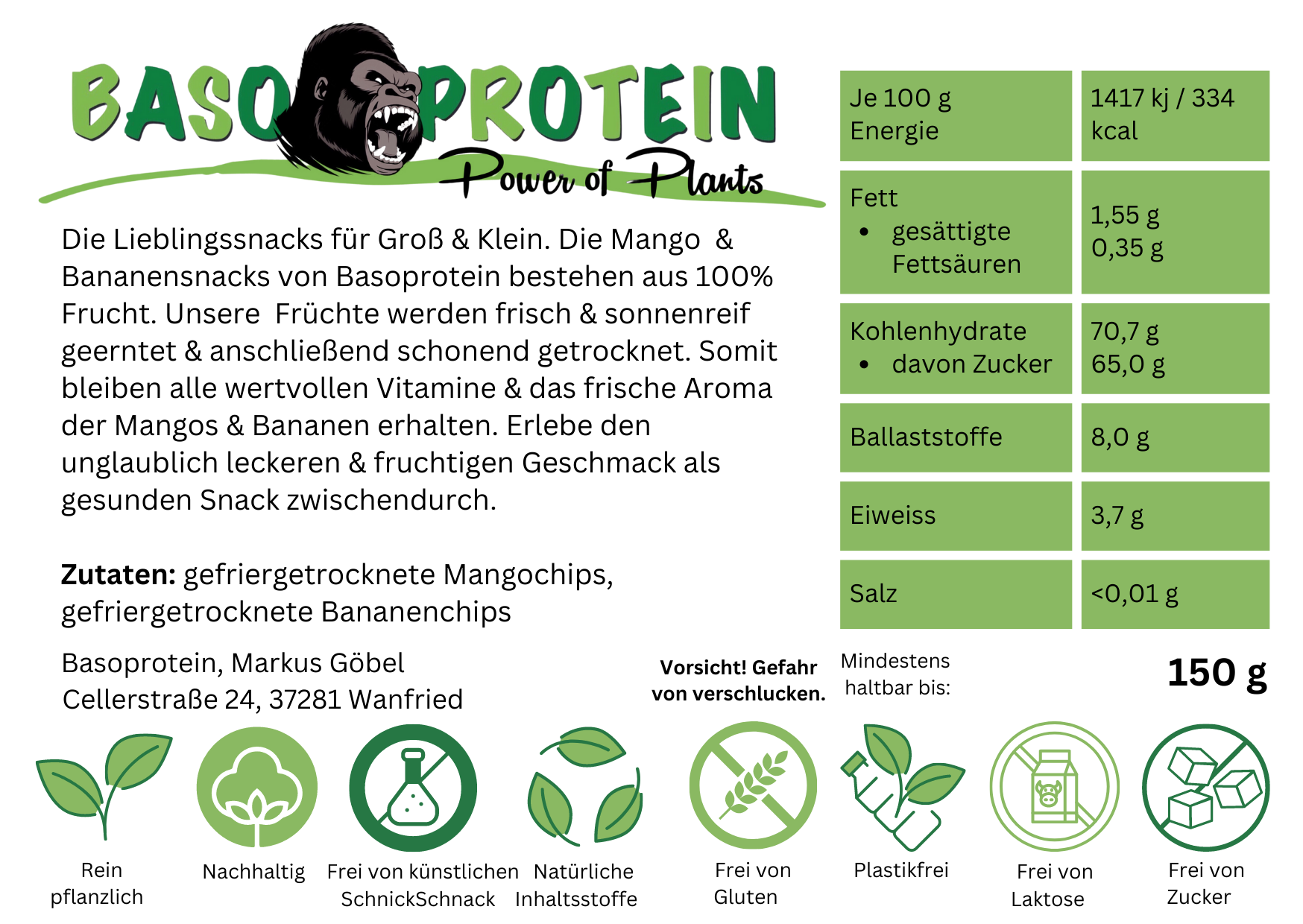 Die Lieblingssnacks für Groß und Klein. Die Mango,- und Bananensnacks von Basoprotein bestehen aus 100% Frucht. Unsere Früchte werden frisch und sonnenreif geerntet und anschliessend schonend getrocknet. Somit bleiben alle wertvollen Vitamine und das frische Aroma der Mangos und Bananen erhalten. Erlebe den unglaublich leckeren Geschmack als gesunden Snack zwischendurch.