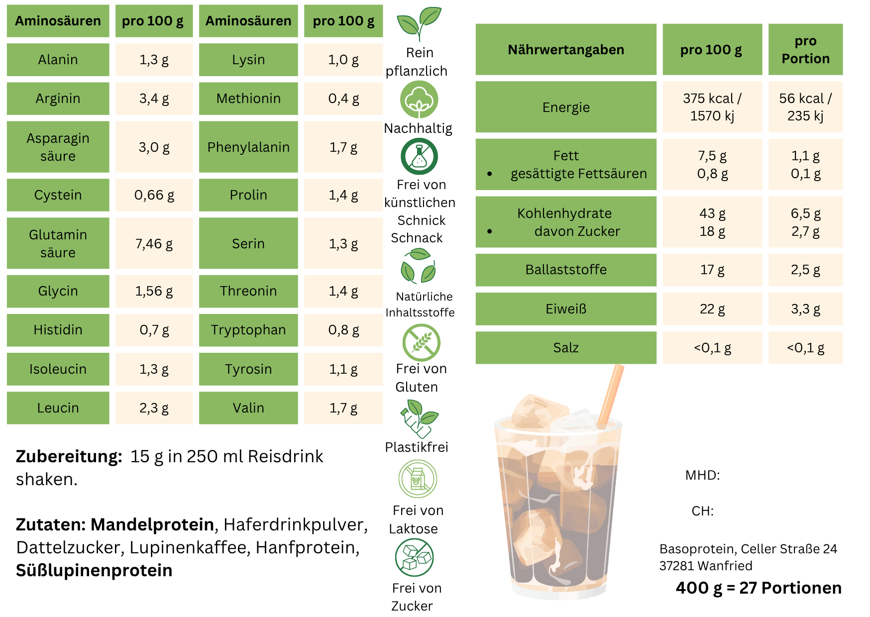 Unsere Produkte sind 100 % pflanzlich, basisch und frei von künstlichen Zusätzen, Zucker sowie ungesunden Ersatzstoffen. Wir kombinieren hochwertige Rohstoffe wie Süßlupine, Hanf, Mandel oder Kurkuma mit funktionellen Rezepturen für deinen Alltag.