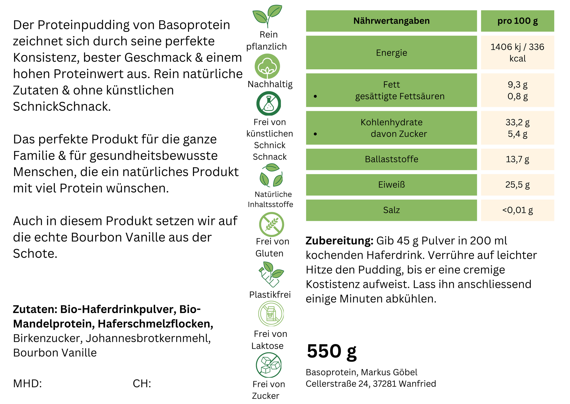 Cremiger Genuss mit echter Bourbon Vanille: Unser Proteinpudding überzeugt mit perfekter Konsistenz, bestem Geschmack & einem hohen pflanzlichen Proteinwert.