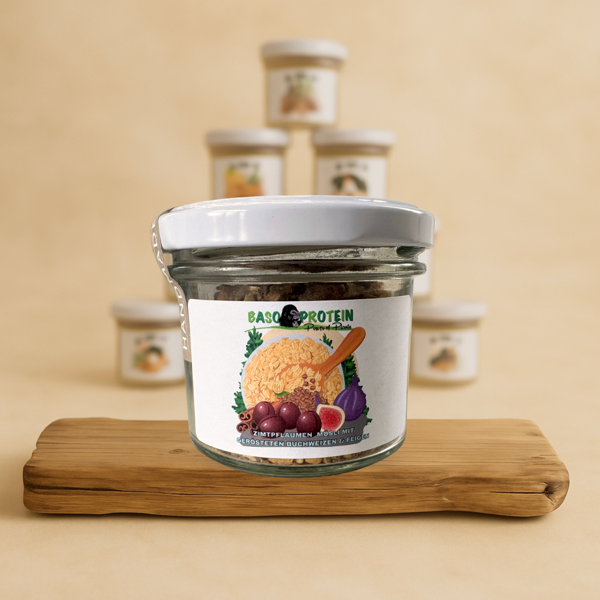 Zimtpflaumen Müsli mit geröstetem Buchweizen und Feigen Probierportion